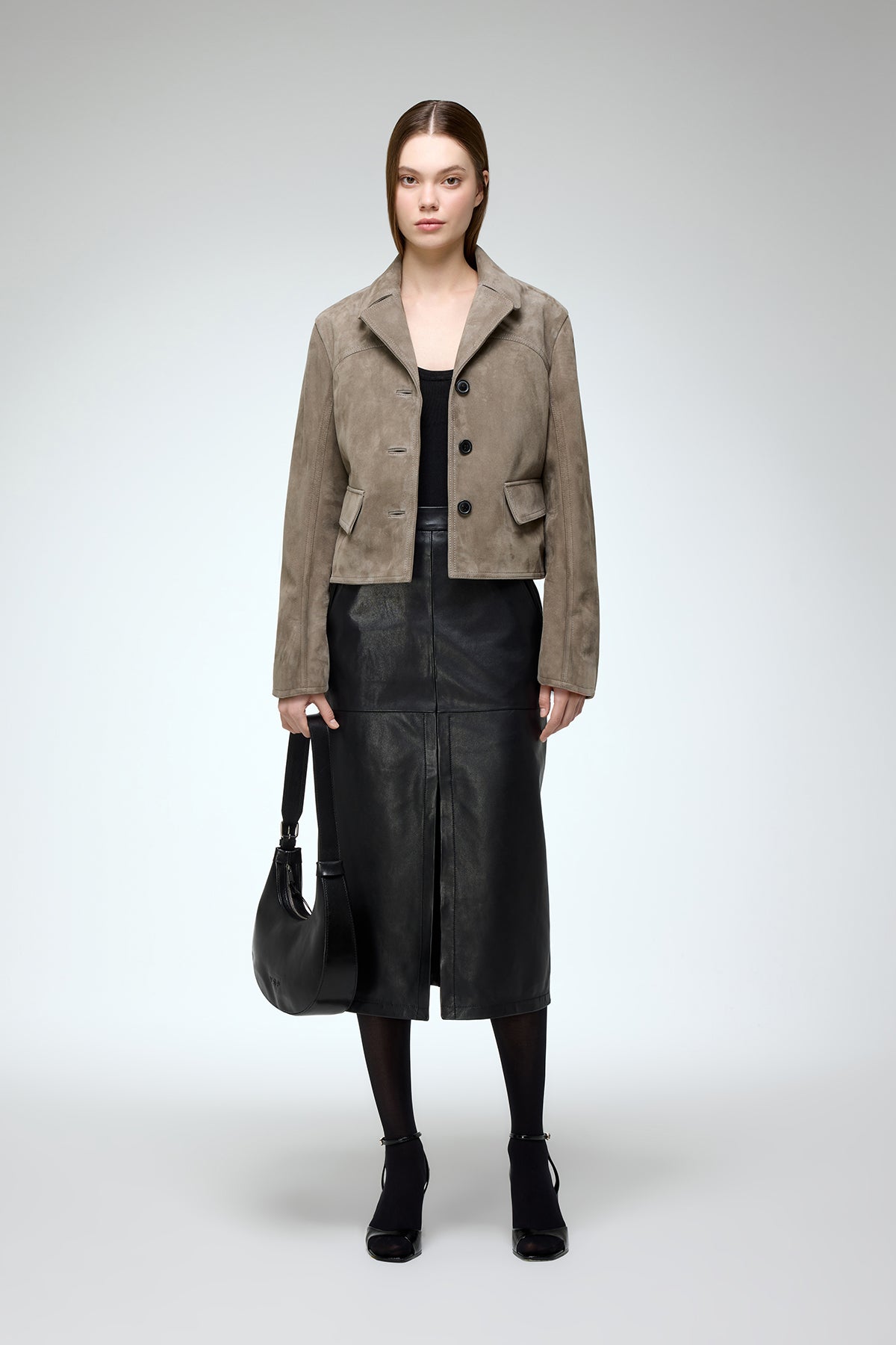 - Kurze, kastenförmige Lederjacke im Blazer-Stil mit Knopfleiste, aufgesetzten Taschen und kleinem Reverskragen.