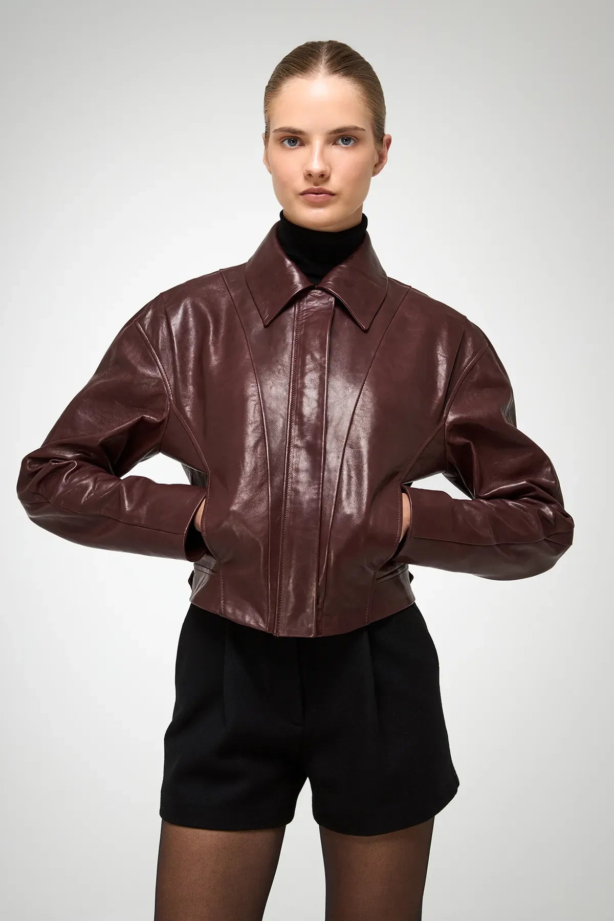 - Figurbetonte, kurze Lederjacke mit Hemdkragen und verdecktem Frontreißverschluss.