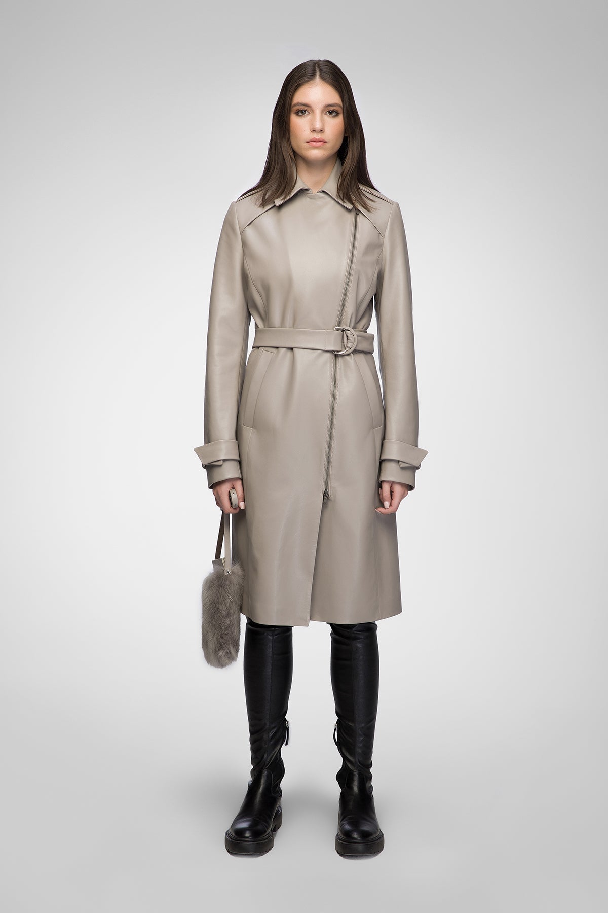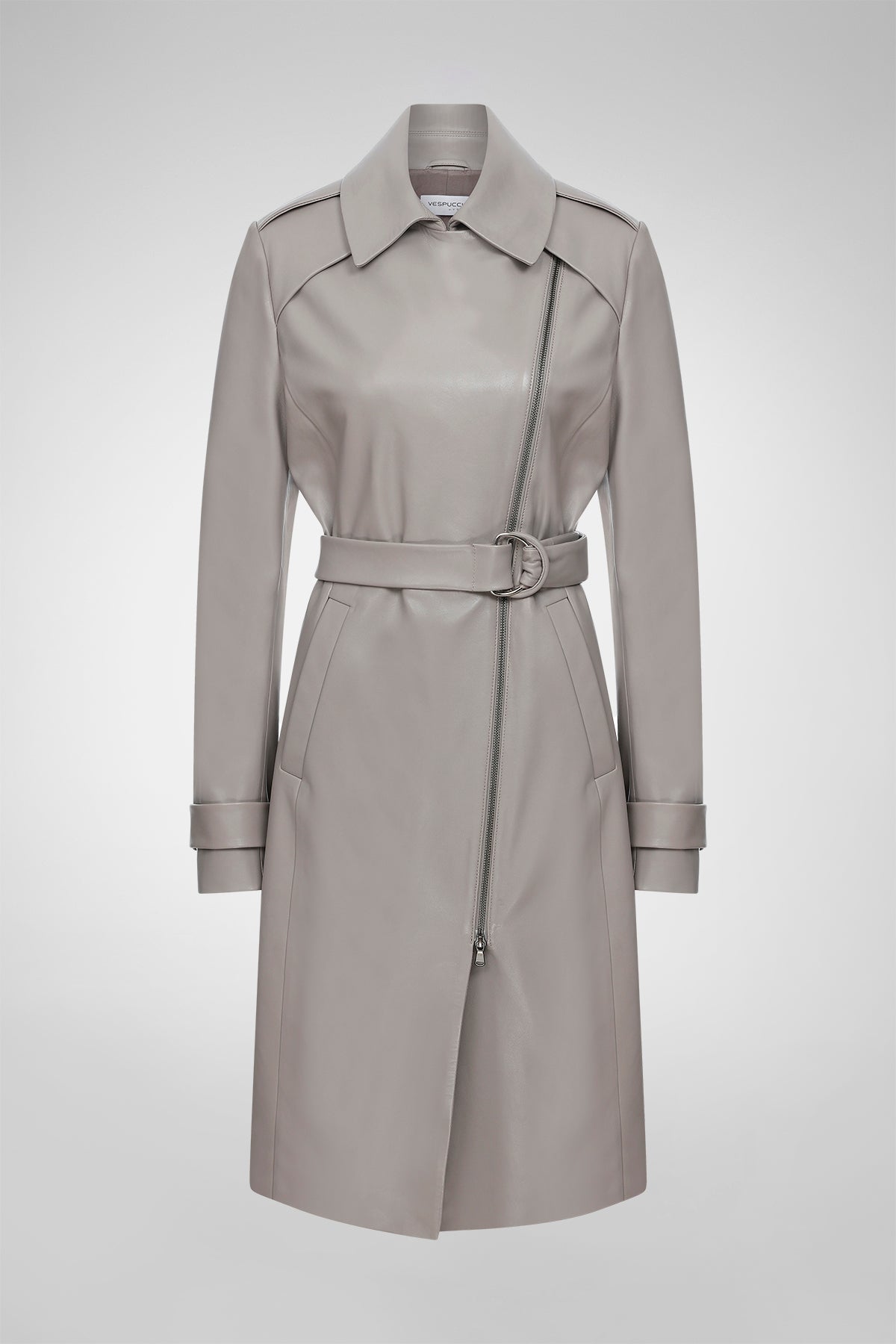 - Lässig geschnittener, mittellanger Ledermantel mit Reißverschluss und Gürtel in der Taille.