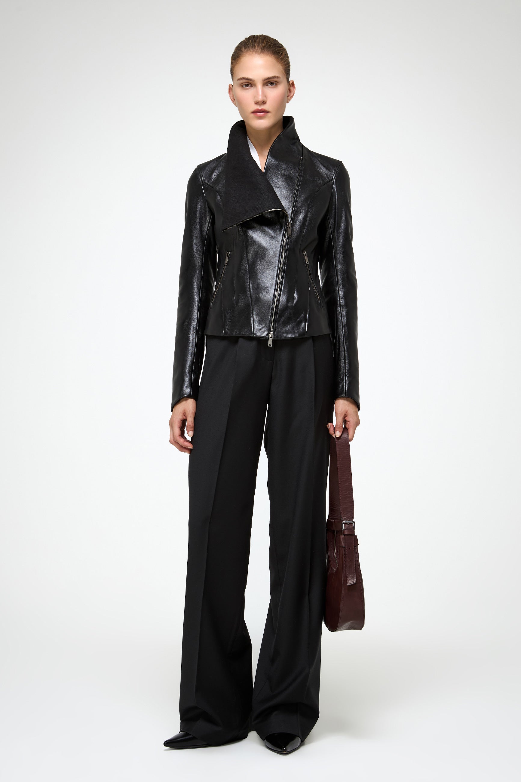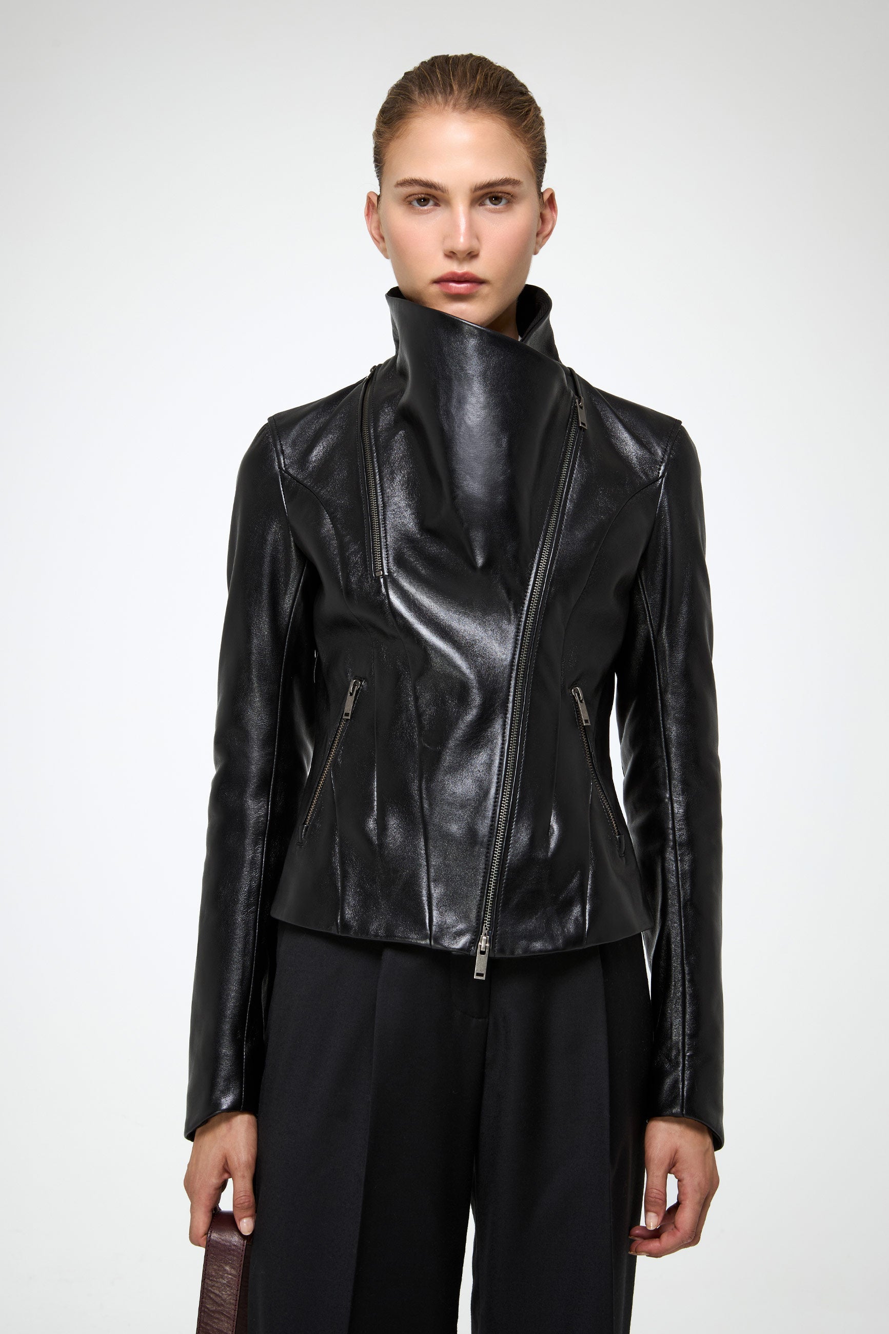 - Leicht taillierte Lederjacke mit asymmetrischem Frontreißverschluss.