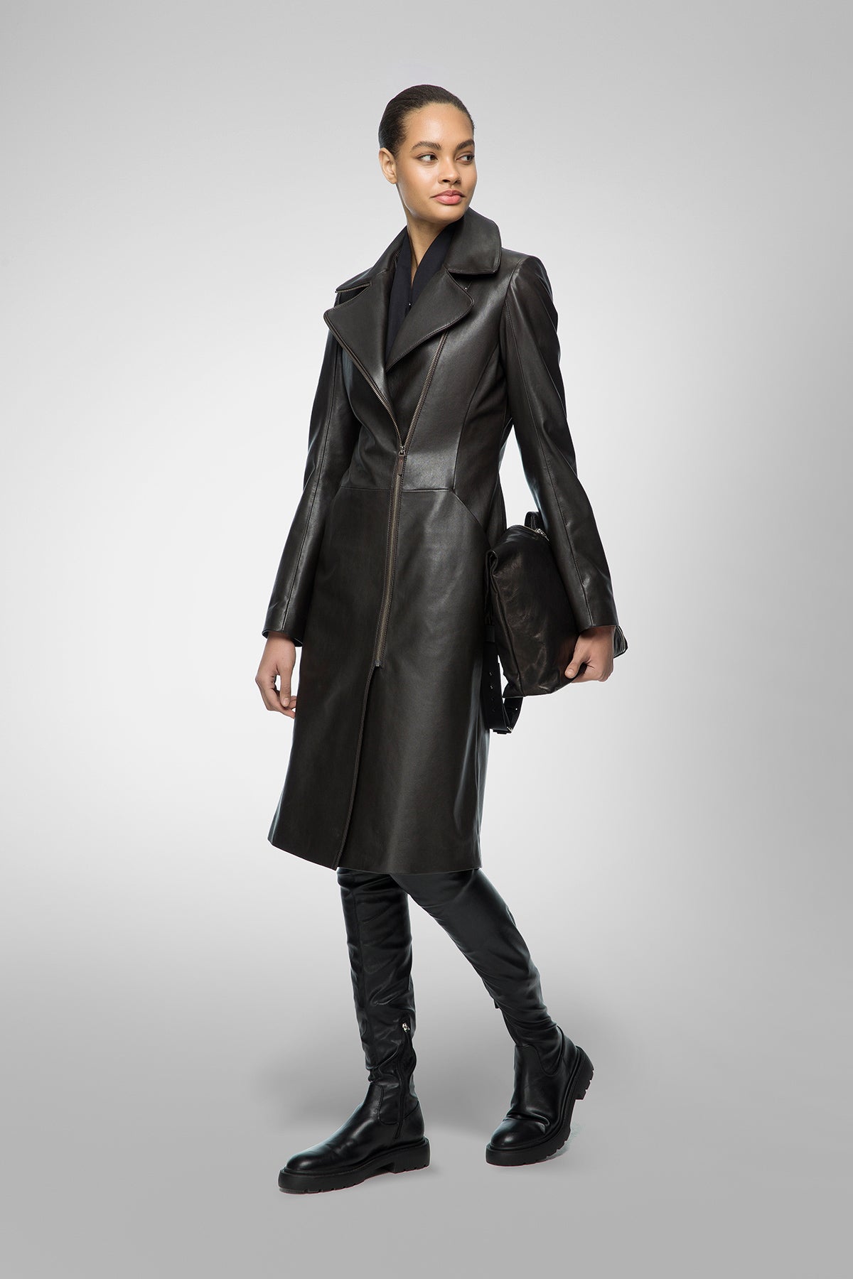 - Taillierter, langer Ledermantel im Biker-Stil mit Reißverschluss vorne.