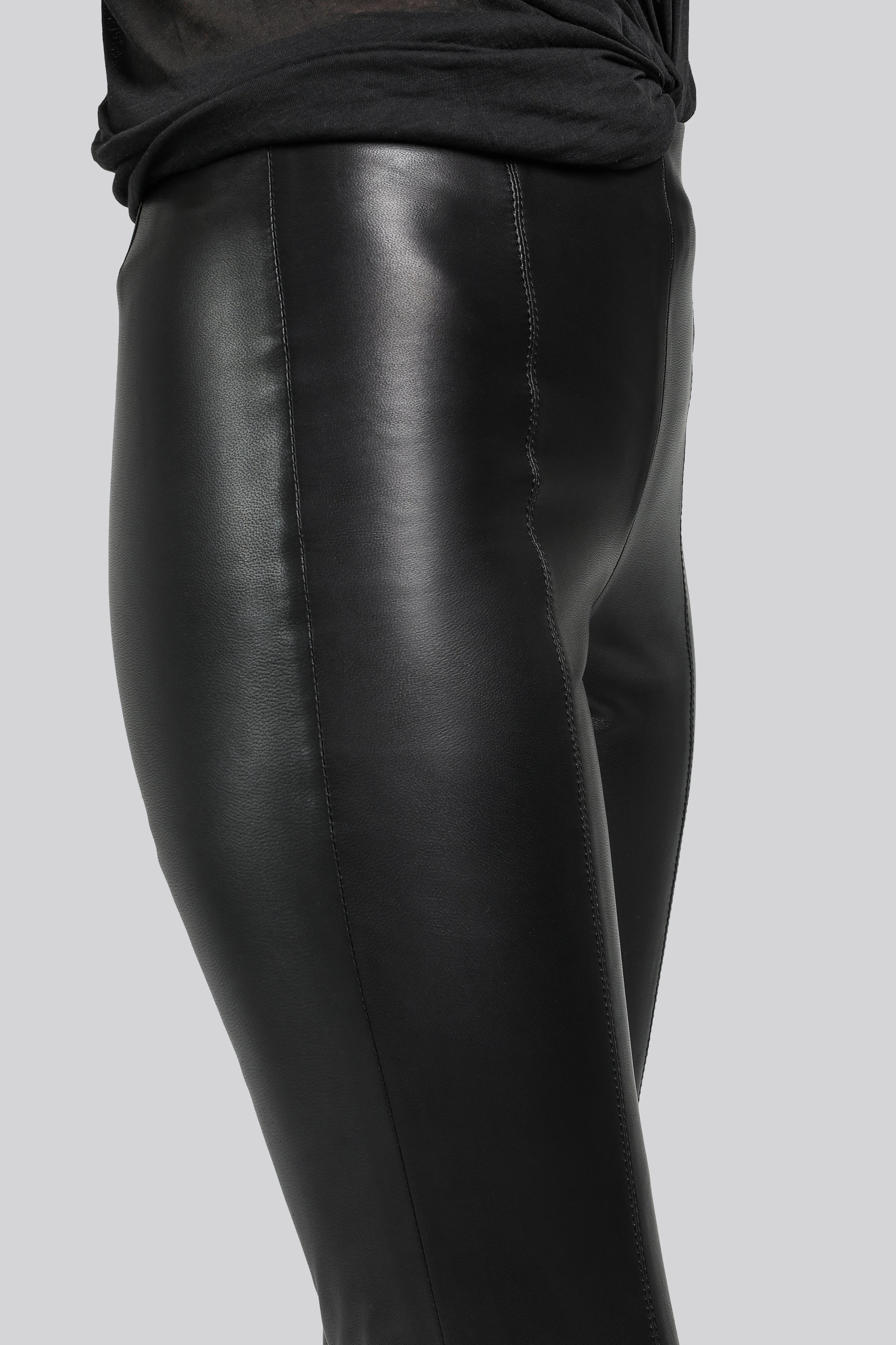 - Hochgeschnittene, knöchellange, gerade geschnittene Lederhose.