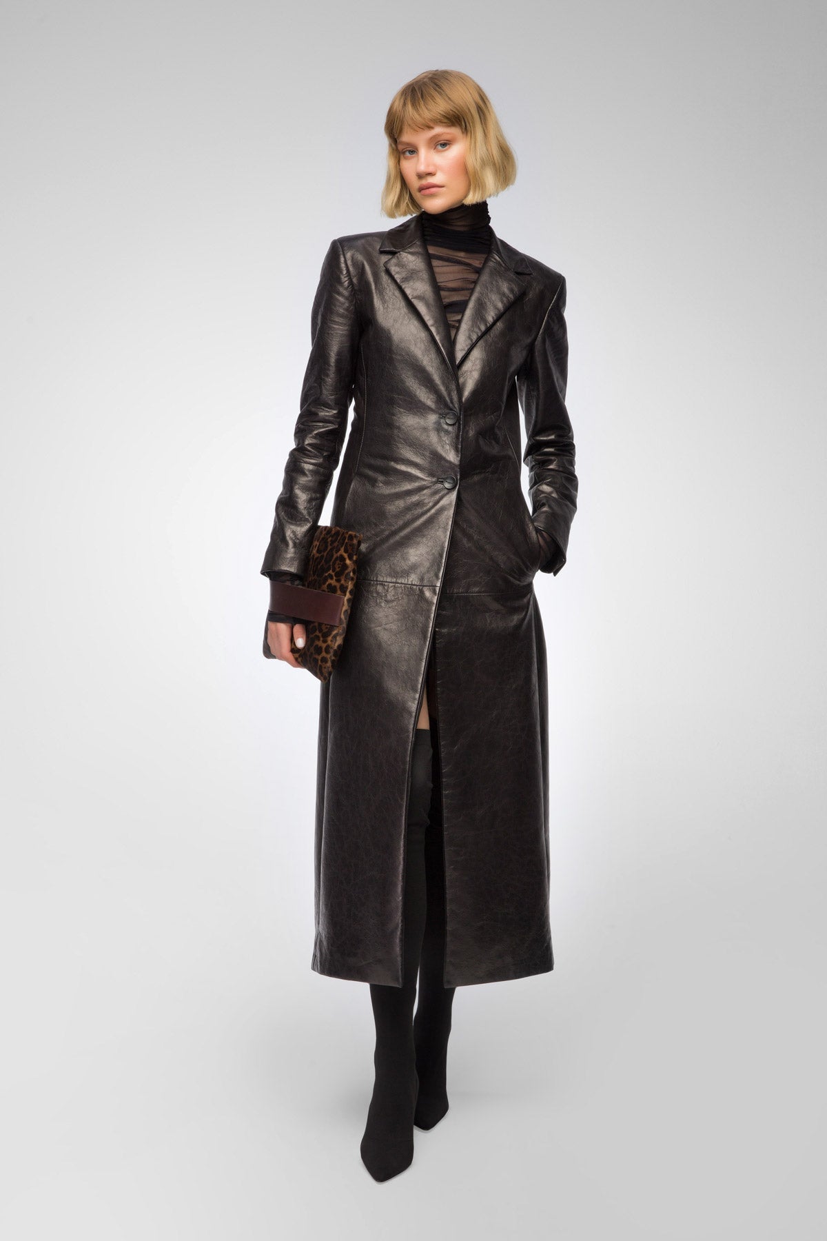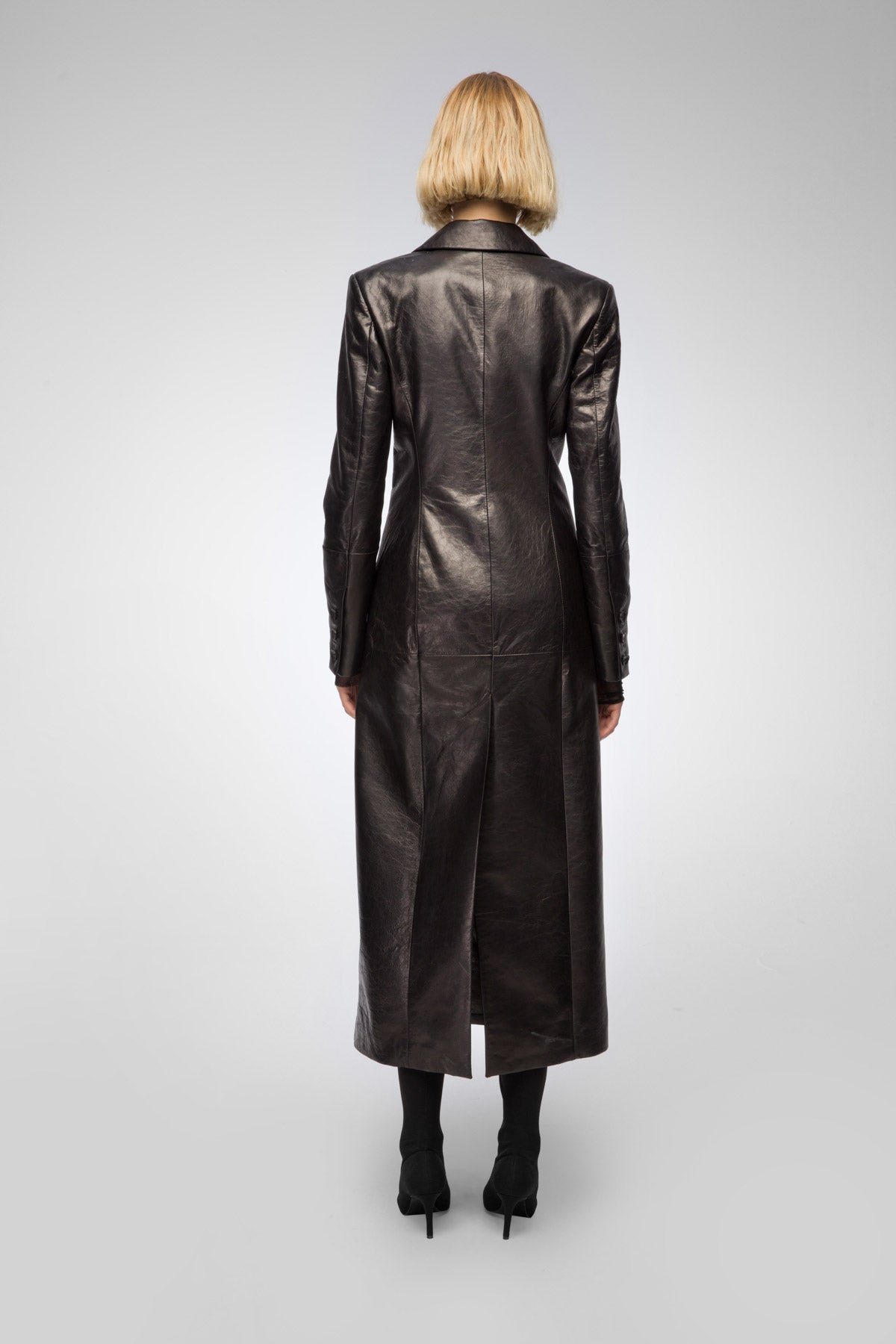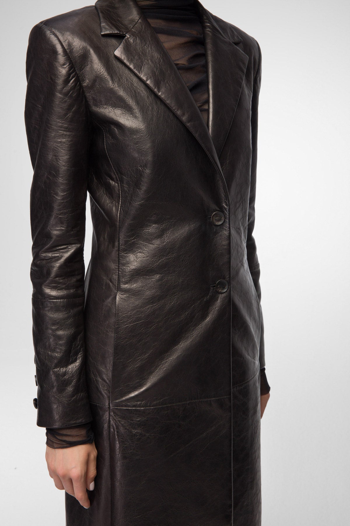 - Taillierter, einreihiger Ledermantel mit Seitentaschen.
