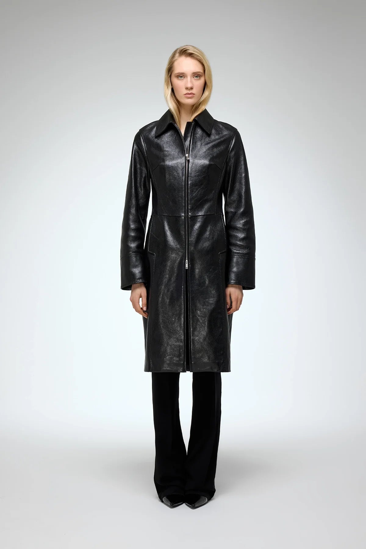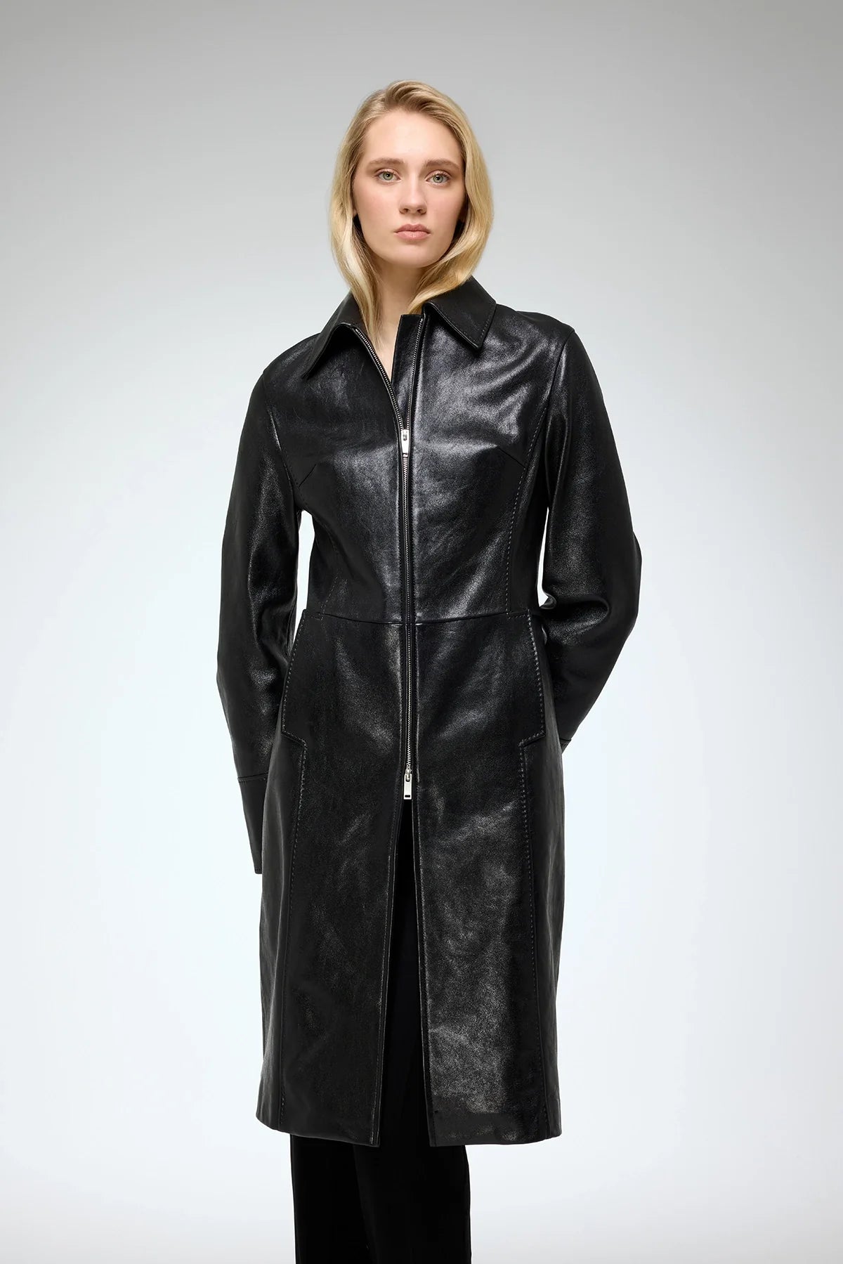 - Hemdkragen, mittellanger, taillierter Ledermantel mit Reißverschluss.