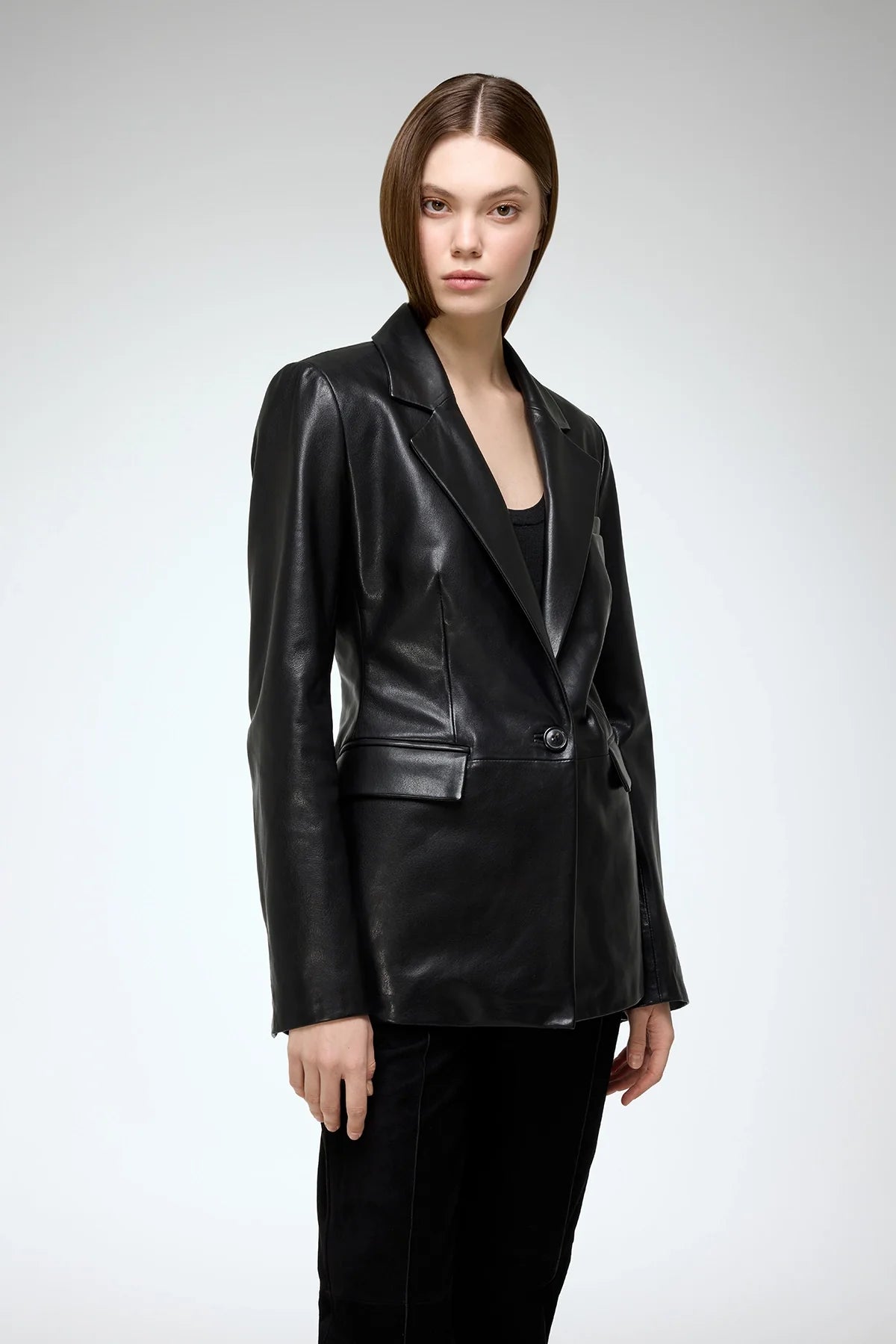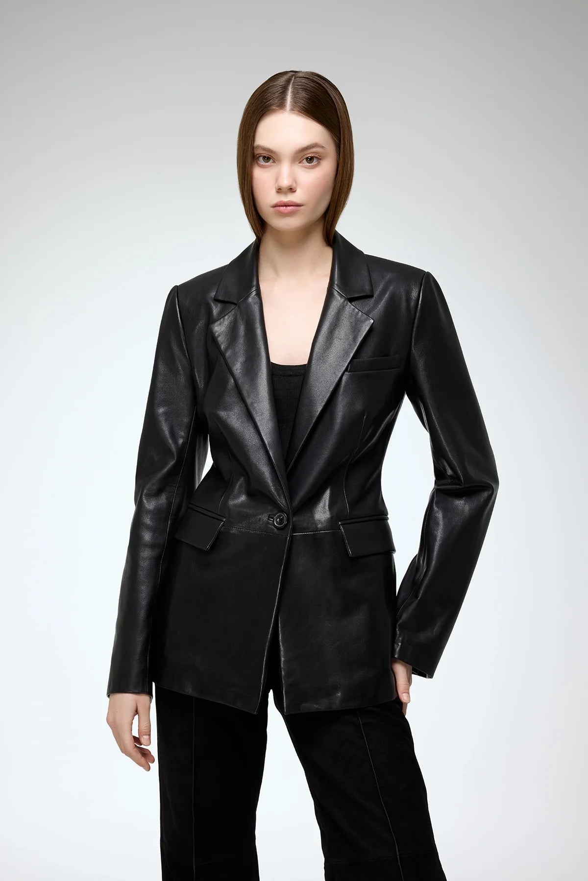 - Dieser hüftlange, einreihige Blazer aus 100 % weichem Lammveloursleder mit luxuriöser Verarbeitung verleiht jedem Outfit einen eleganten Touch.