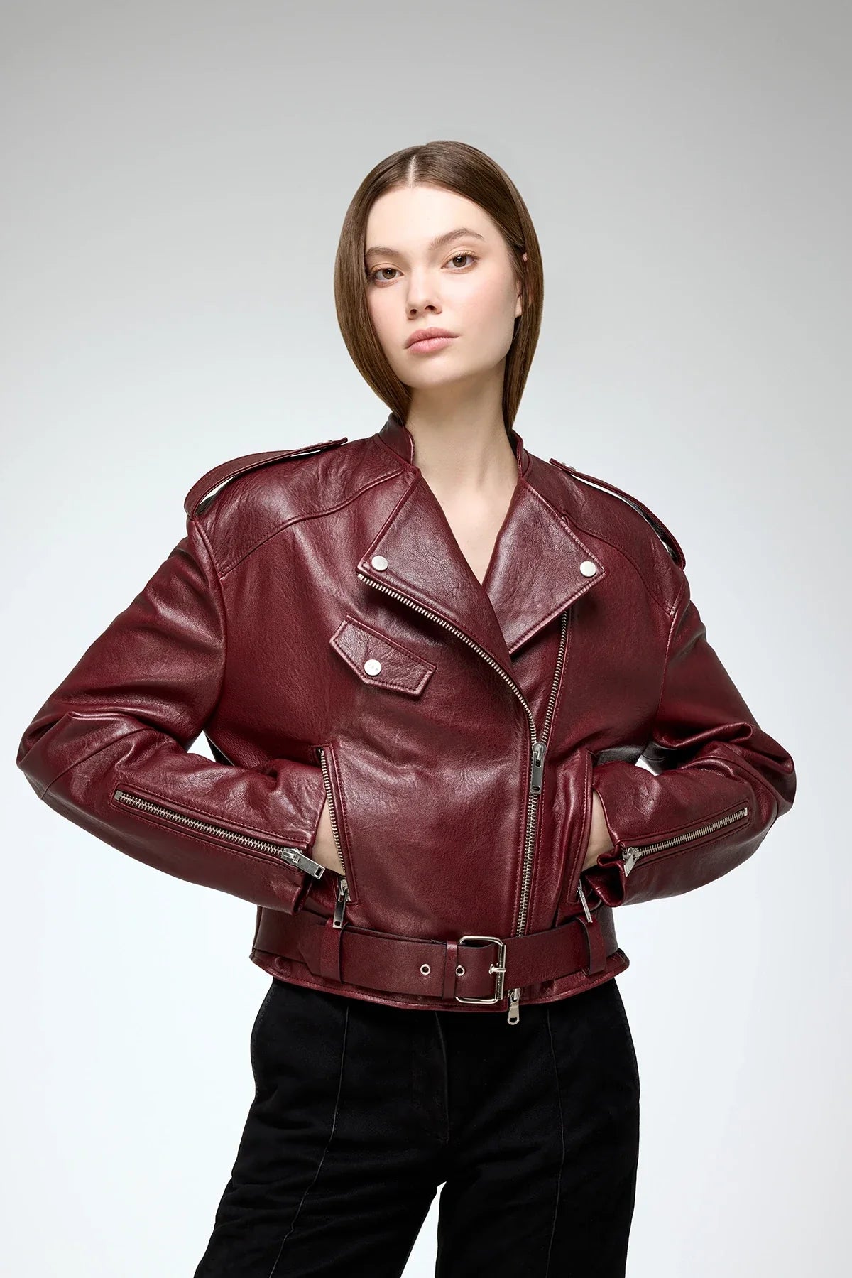 - Kurze Lederjacke im Biker-Stil in normaler Passform.