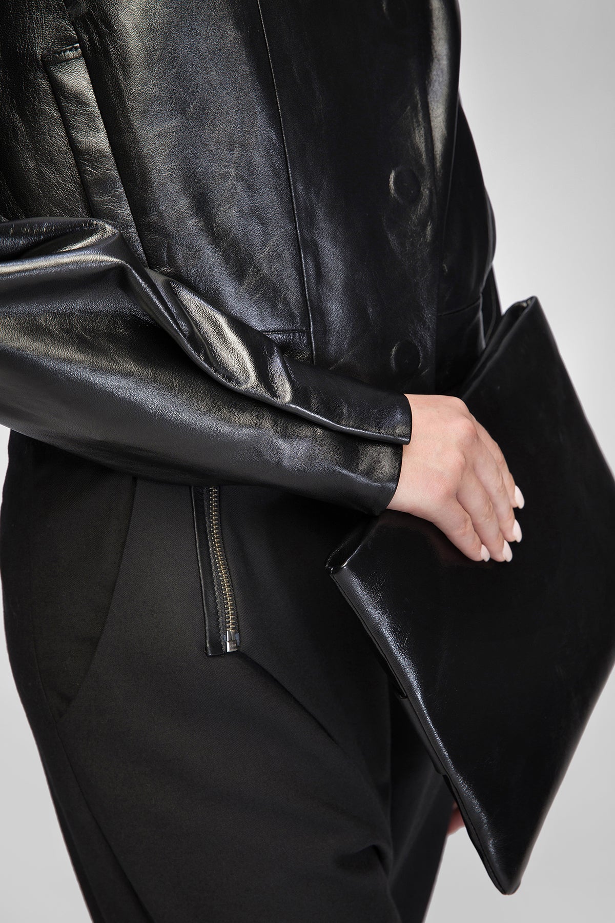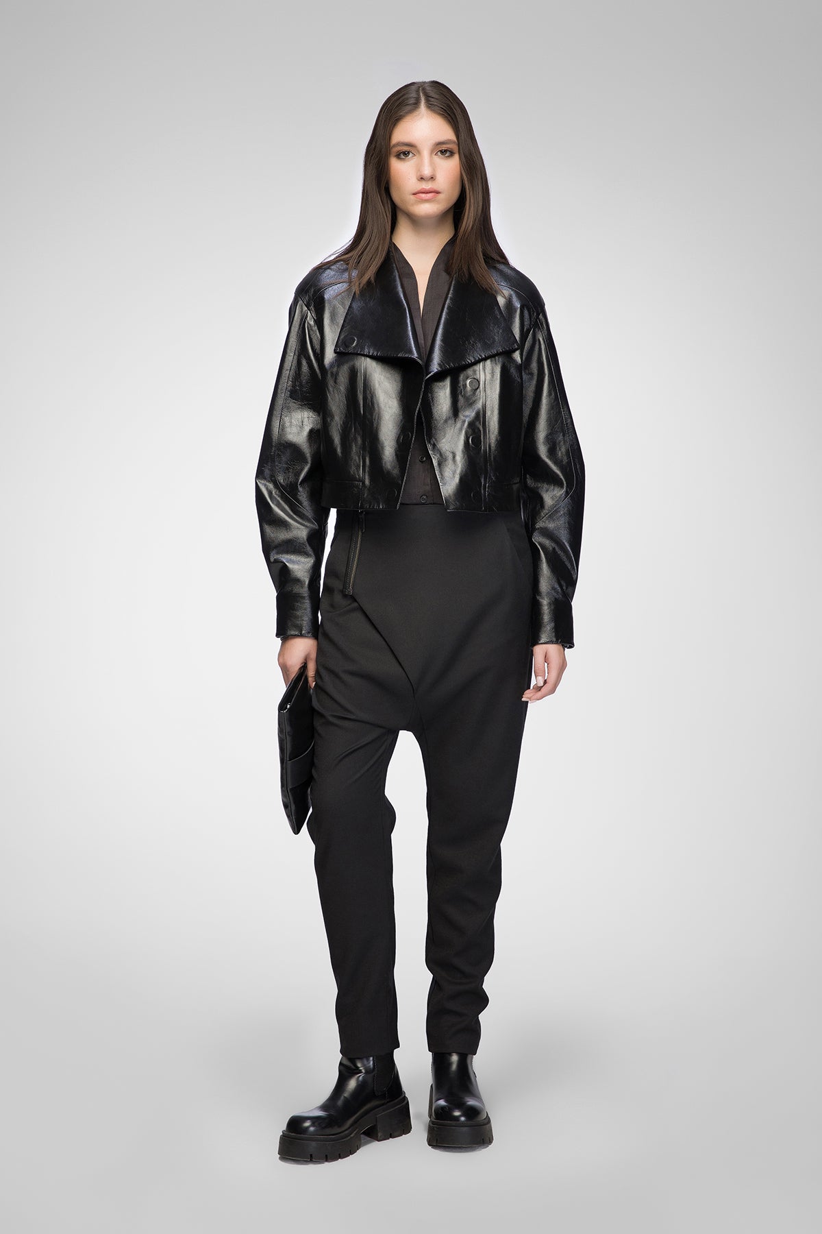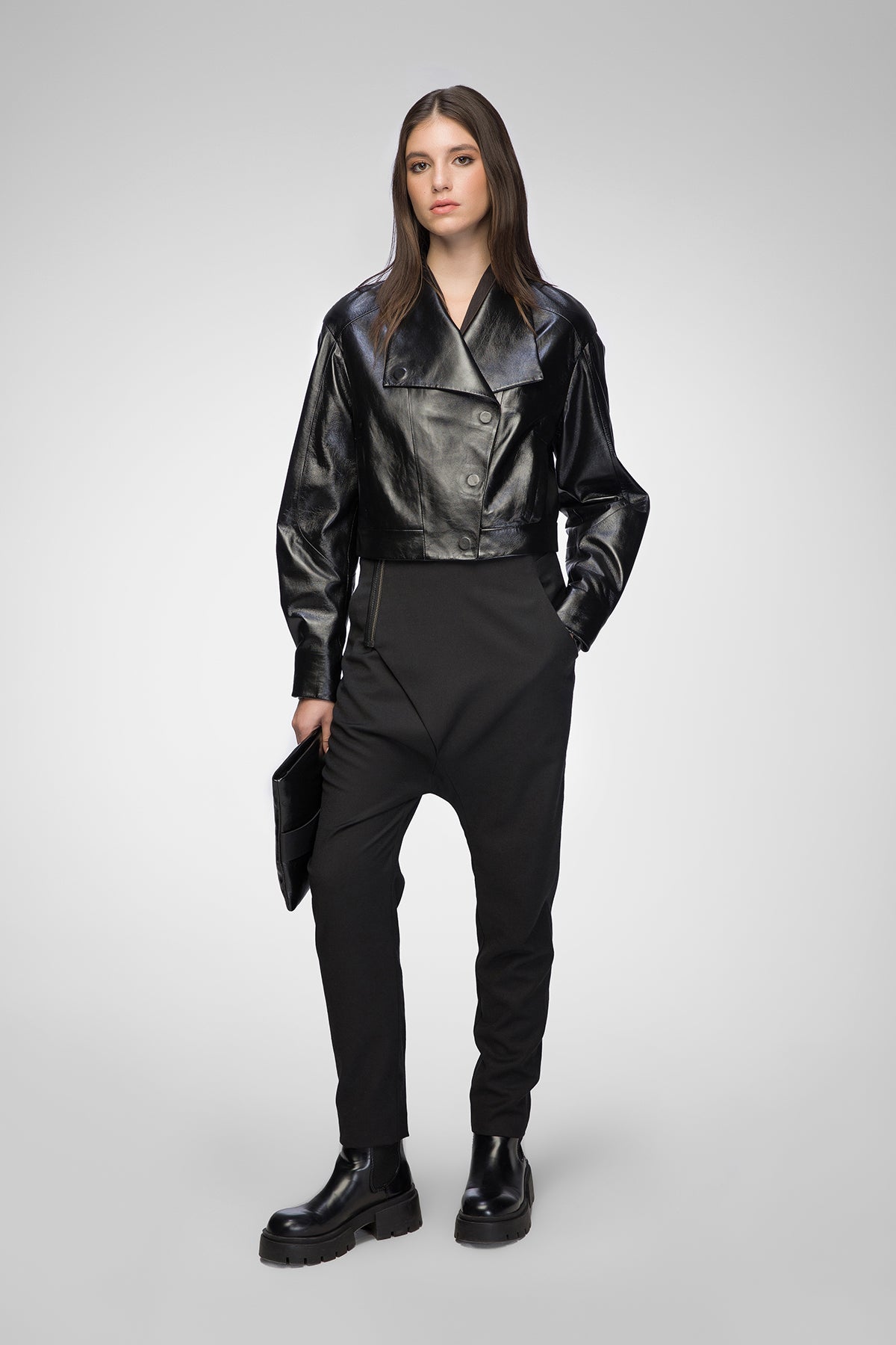 - Kurze Lederjacke mit asymmetrischem, überkreuztem Frontverschluss.