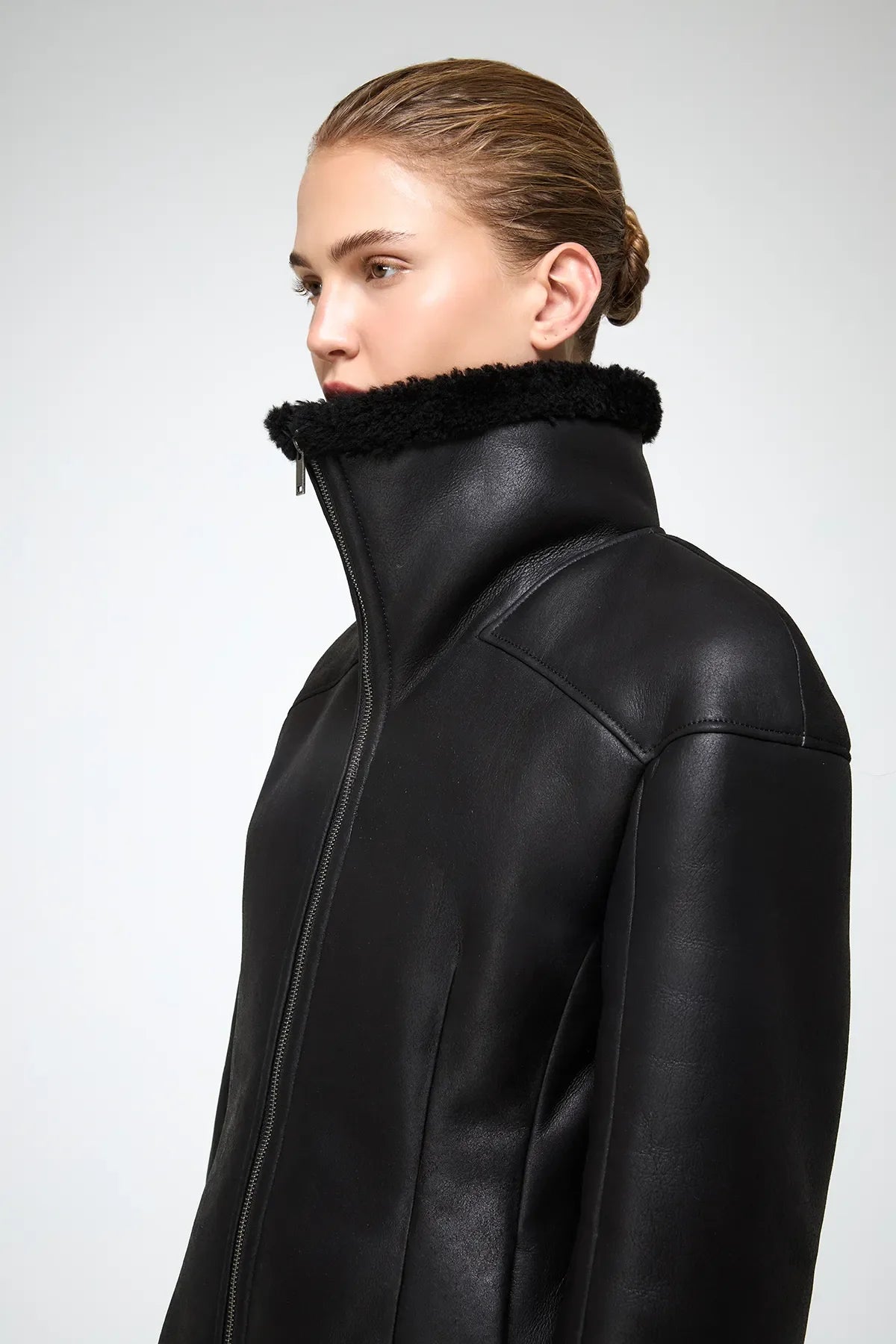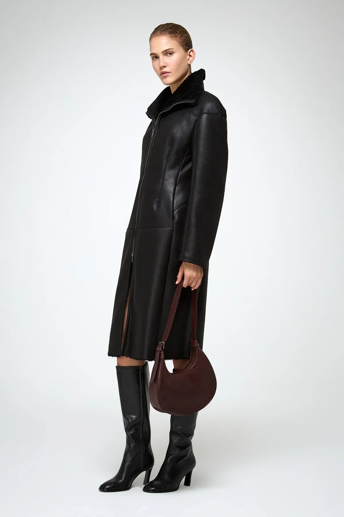 - Dieser knielange Mantel aus 100 % Lammleder besticht durch einen Reißverschluss vorne, strukturierte Schultern und eine taillierte Silhouette.